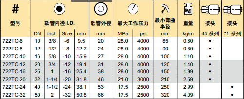 適用介質:石油基液壓油,水乙二醇,潤滑油,空氣和水。用于1.7MPa以上的空氣時,軟管需針刺。