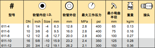 適用介質(zhì):石油基液壓油,水乙二醇,油水乳化液,油脂,潤(rùn)滑油,原油,燃油,空氣和水。用于1.7MPa以上的空氣時(shí),軟管需針刺。